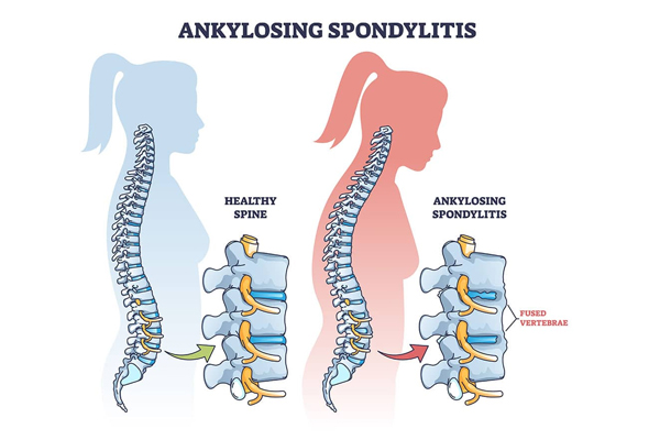 - Advanced symptoms can be chronic, severe pain and stiffness in the back, spine and possibly peripheral joints, as well as lack of spinal mobility because of chronic inflammation and possible spinal fusion.